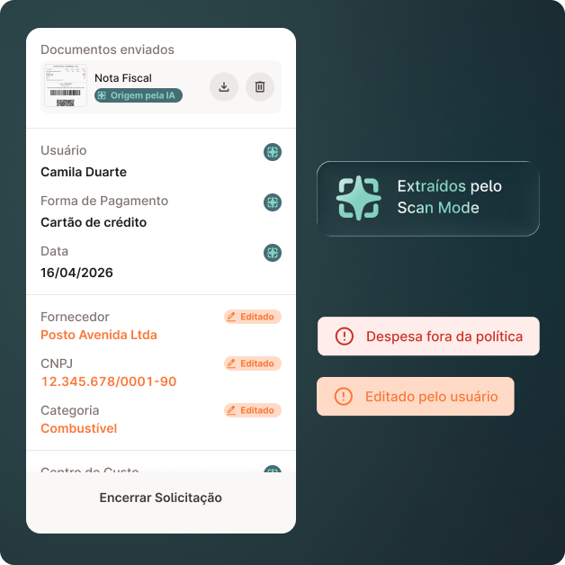 O Scan Mode lê o comprovante e preenche tudo com IA: CNPJ, categoria, descrição.