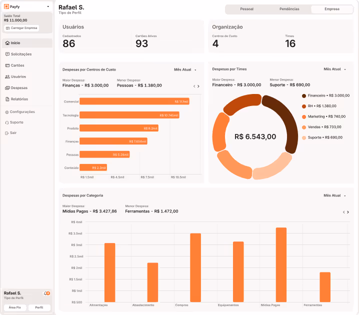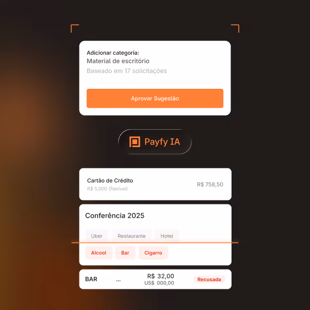 A IA da Payfy é um sistema antifraude, que monitora seus gastos o tempo todo, evita erros, emite alertas de transações fora da política e mantém tudo em conformidade.