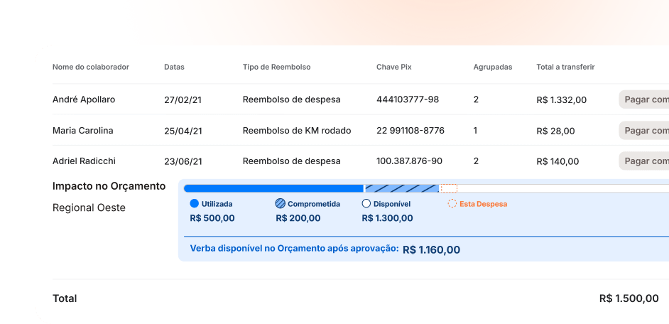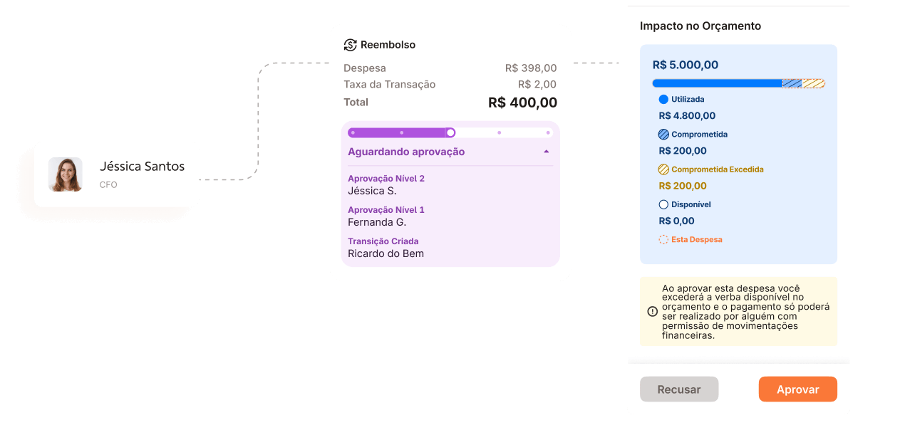 Responsáveis aprovam despesas e gerenciam verbas sem precisar de permissões financeiras extras.