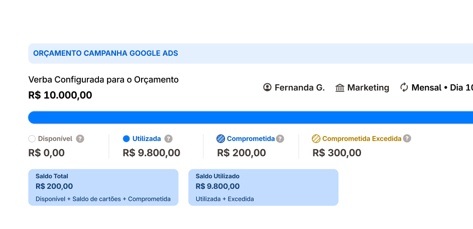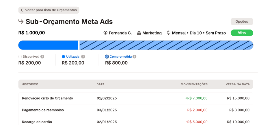 Carregue cartões direto do orçamento. O saldo é contabilizado automaticamente na verba disponível.